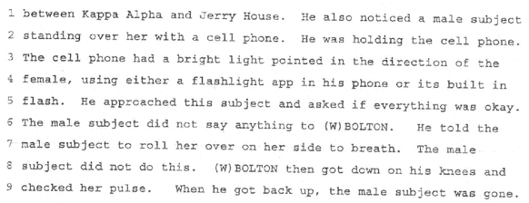 “The cell phone had a bright light pointed in the direction of the female,” the police report quotes the witness. The report additionally quotes the witness as saying “using either a flashlight app or the phone or its built-in app.” After Turner left the scene, the witness went over to make sure everything was all right and tried to help the victim.