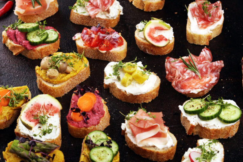 Little bites of bread with the perfect toppings are a great snack for your summer bash. Mix up the ingredients to combine salty, sweet, and savory. Each bite can be completely different for everyone, use your imagination and use the best summer flavors.