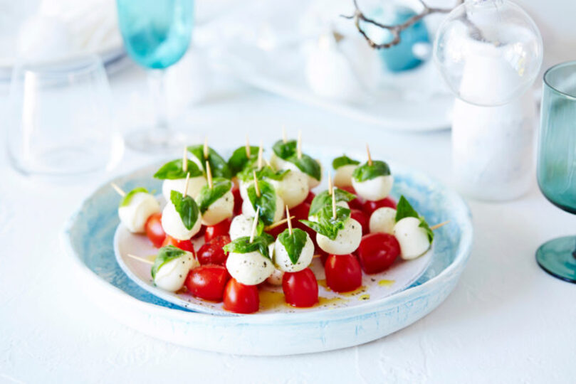 Little Caprese bites are perfect for guests because they’re easy to reach and fun to eat!