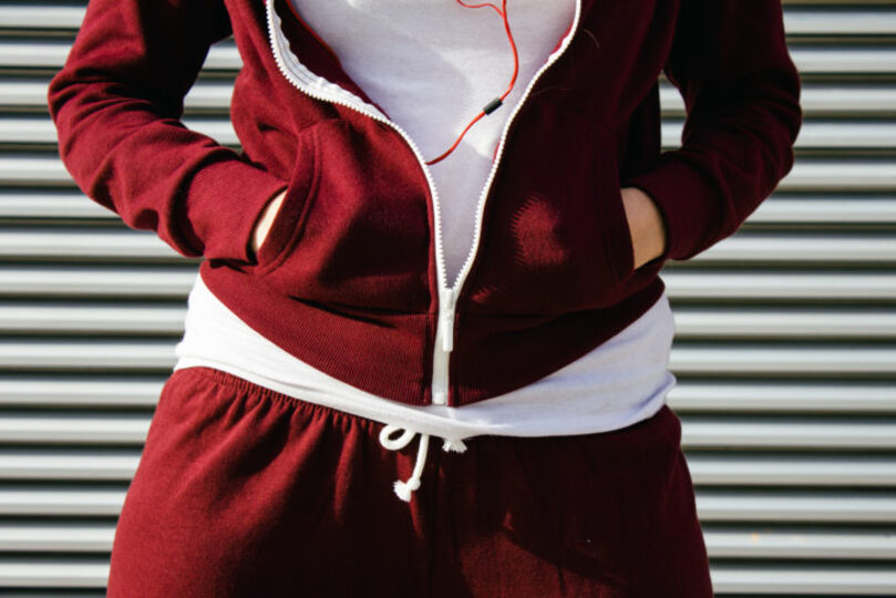 You can give your athleisure outfit a glam twist with the help of an added clutch and matching high heels. Style it with a scoop neck white tee to emphasize your necklace and finish it off with statement earrings. This outfit is perfect for anyone who wants to be comfortable but still turns heads when you walk into a room.